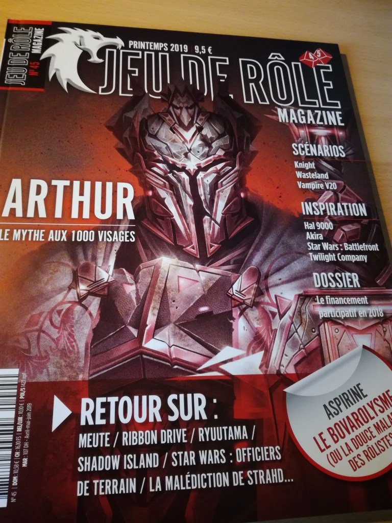Le DOSSIER : le Roi Arthur : compulsant cet article avec grand plaisir, je ne m’attendais pas à un tel travail sur les origines arthuriennes dans la littérature, qui précède un exposé sur ses utilisations contemporaines à travers les différents médias dont le jeu de rôle. C’est ainsi que j’ai réalisé être passé à coté des principaux JDR chevaleresques, préférant les sombres héros moorcockiens ou lovecraftiens. Seule exception sans doute : Star Wars, bien que j’ai rapidement préféré y incarner des mercenaires plutôt que des Jedis… L’auteur livre un travail formidable de recherche et de vulgarisation, alors même que ce n’est pas le sujet qui m’attire le plus. Si un lecteur est fasciné par les chevaliers et la légende du roi Arthur, il lui faut ce dossier pour en faire une riche source d’inspiration.