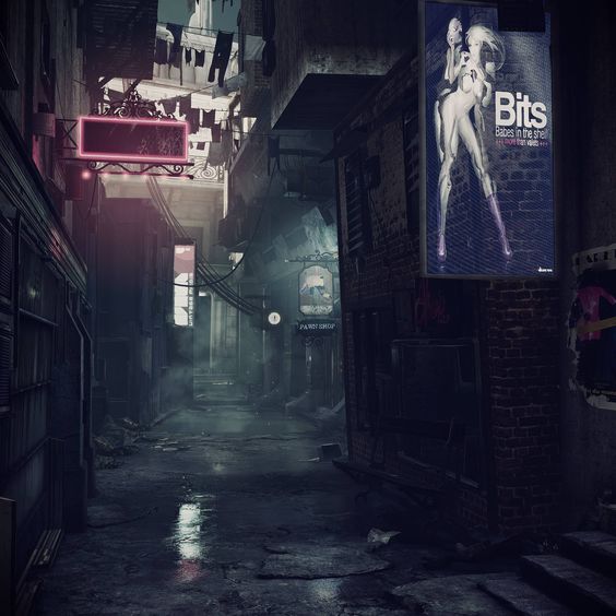 Le repaire de Grey est situé à 45 minutes en moto de l’Oxo’s Paradise : Quartier aux grands immeubles d’habitation, aux enseignes lumineuses japonaises, superpositions de bars, maisons closes, commerces plus ou moins légaux d’équipements high tech. A deux encablures d’une rue déserte et glauque, un véhicule se fait désossé par des gangers de petite taille qui s’enfuiront à l’arrivée des protagonistes. Une vieille grille marque une entrée sous des alcôves aux imposants piliers poussiéreux.